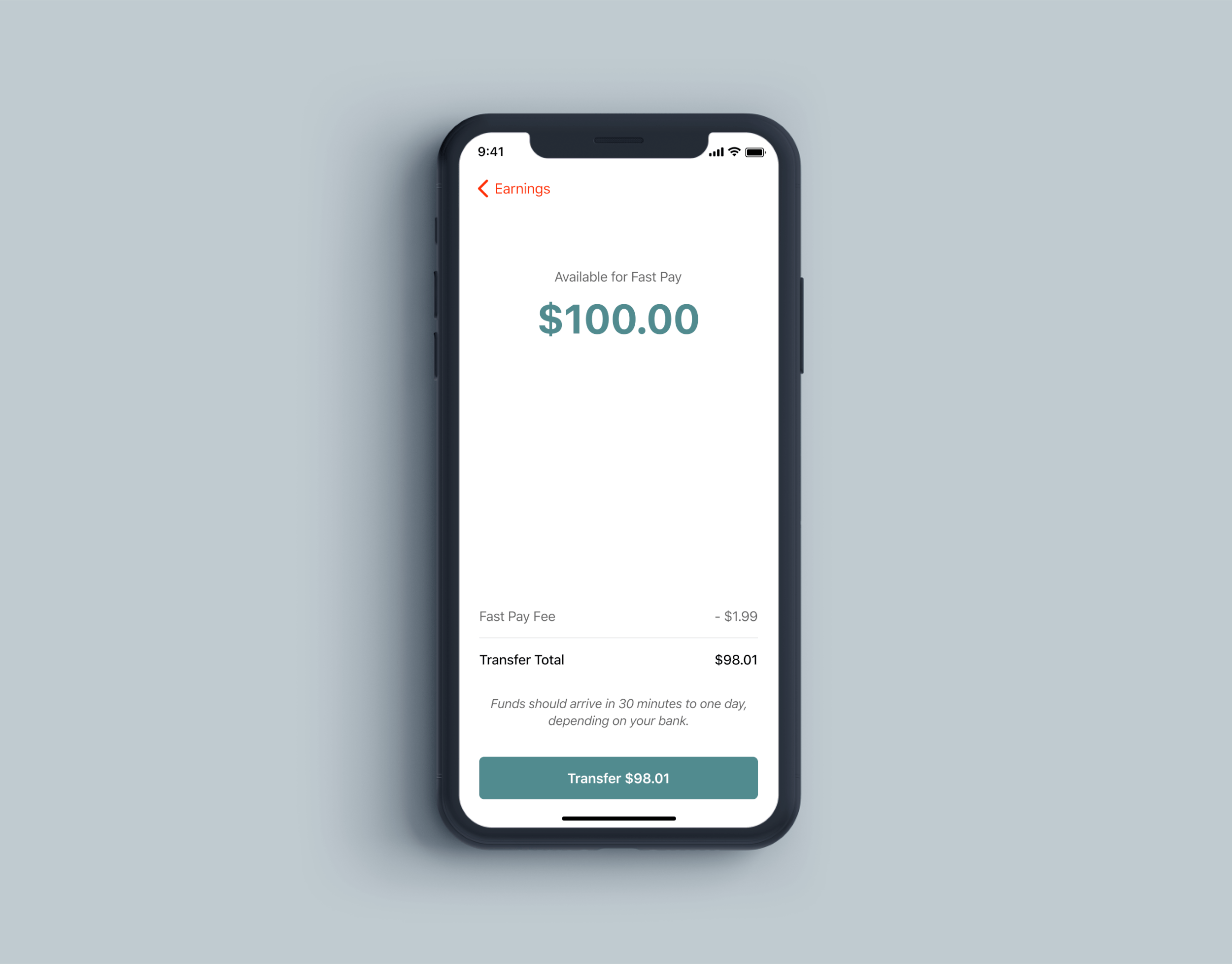 Because transfers could now be made on-demand, we considered moving away from the “weekly earnings” paradigm entirely. Similar to Venmo, we could instead emphasize the current balance available to transfer. Transferring funds would create a new transfer line item, where earnings and fee details would be displayed.